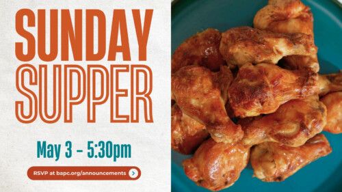 Meet new faces and reconnect with familiar ones at our monthly fellowship dinners! May’s entree will be chicken drumsticks. Please RSVP below!