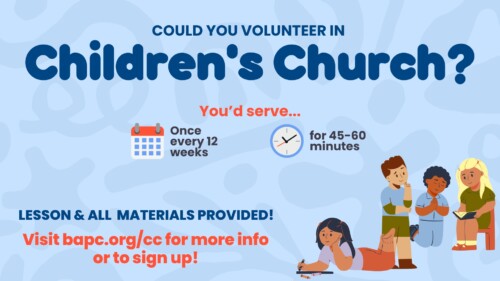 Our Children’s Church ministry is in need of 4 more couples to join our rotation and share the Gospel with BAPC’s youngest members! Want to learn more about what Children’s Church entails? Please contact Hannah Stahl.