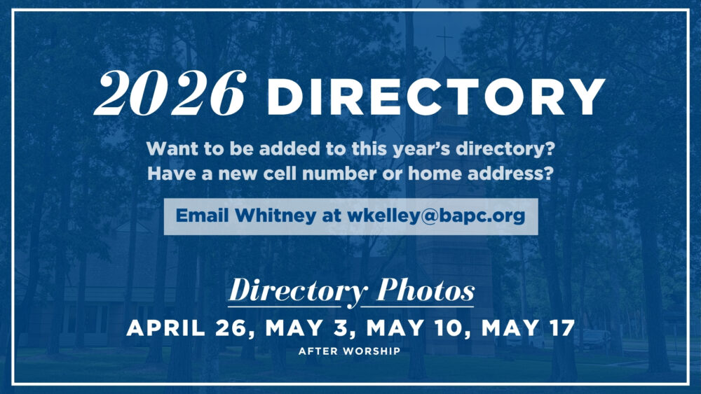 Directory photos will be taken outside after worship on 4/26, 5/3, 5/10, and 5/17.