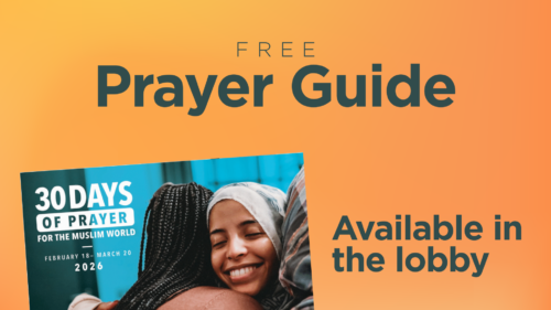 During Ramadan—the month of fasting observed by our Muslim friends and neighbors around the world—we’re invited to join in intentional prayer for them. Our 30 Days of Prayer for the Muslim World booklet offers daily guidance on ways we can pray with compassion and hope. If you’d like to participate, you can pick up a free copy in the lobby, with versions for both adults and children available.