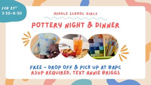 Join us for an evening of fun with friends at our Pottery Night! We’ll get crafty at the Ceramic and Pottery Center, then head to Chick Fil A for dinner. This event is free—please RSVP to Annie Briggs. Drop-off and pick-up will occur at BAPC.