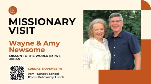 BAPC-supported missionaries Wayne & Amy Newsome will be visiting us on November 9th with updates on their ministry in Japan. Join us for a special Sunday School at 9am, worship at 10:30am, and a fellowship lunch afterwards in the gym!