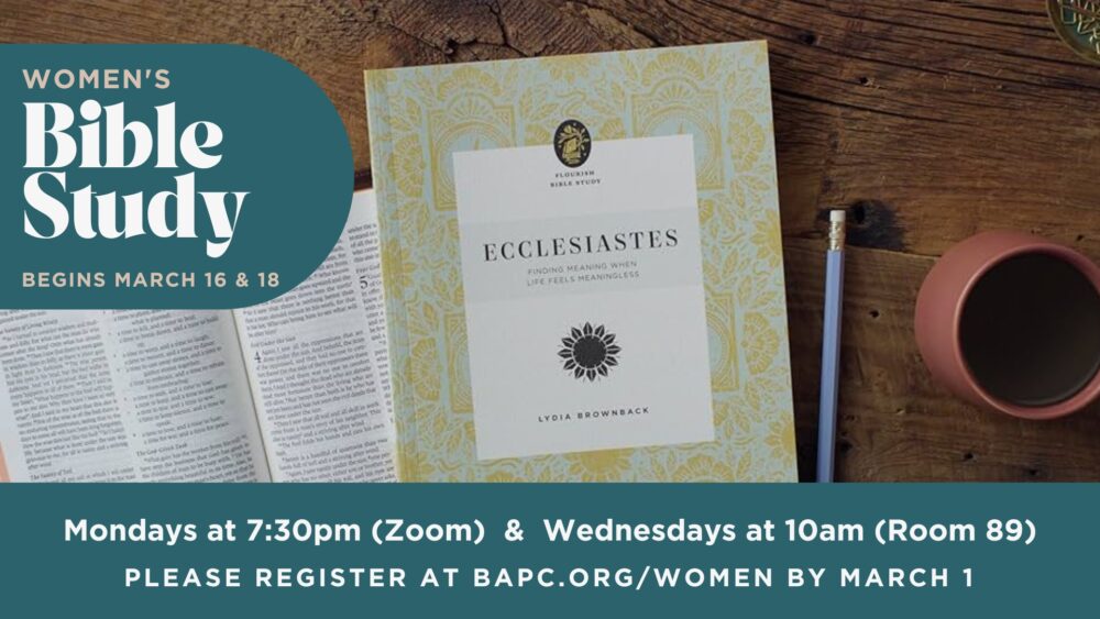 Join us for a 10-week journey through Ecclesiastes as we look to Scripture for hope, meaning, and purpose. This study will be offered on Mondays via Zoom (7:30pm) and Wednesdays at BAPC (10am) beginning March 16 & 18. Childcare is available for a small fee; registration required.