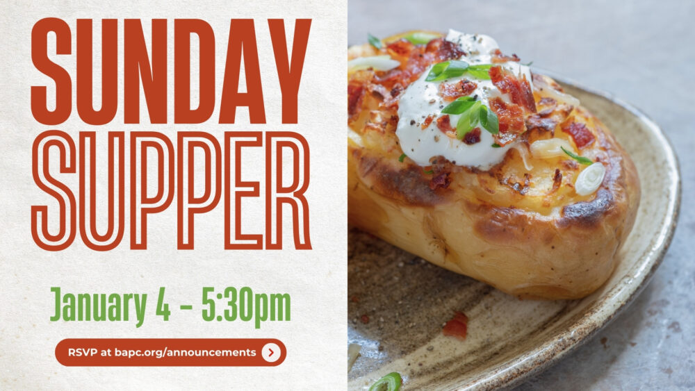 Share a meal and share in fellowship! Join us on the first Sunday of each month at 5:30pm for our Sunday Supper. This month, we'll provide a baked potato bar.